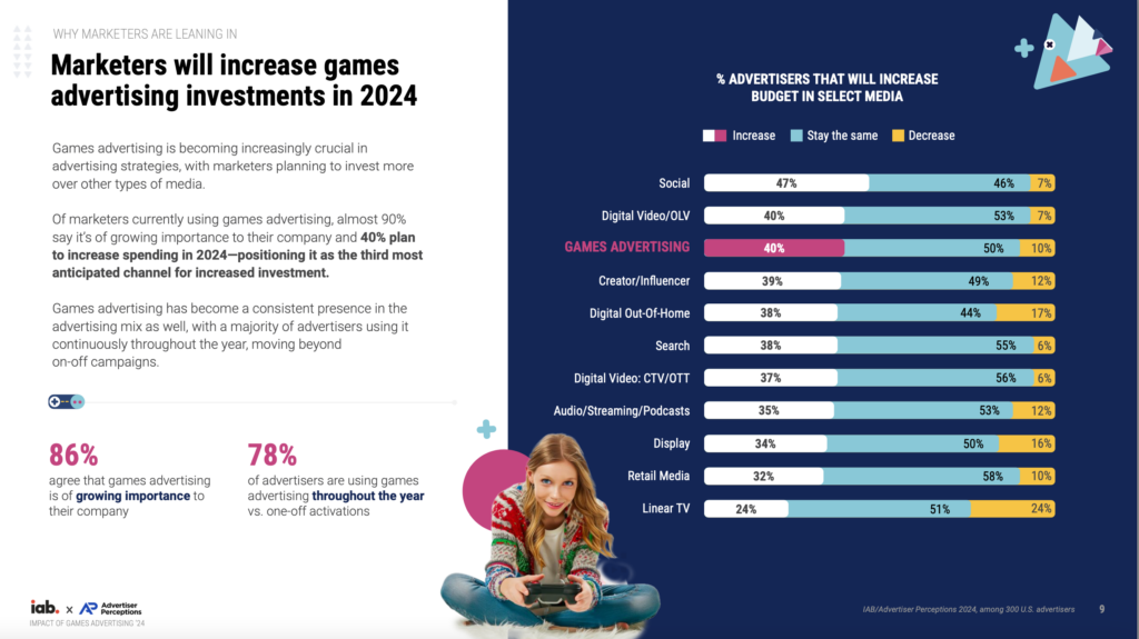 Selon l’étude IAB 2024, près de 40 % des annonceurs prévoyaient d’augmenter leurs investissements dans le gaming, le positionnant déjà comme l’un des canaux les plus dynamiques du paysage média.