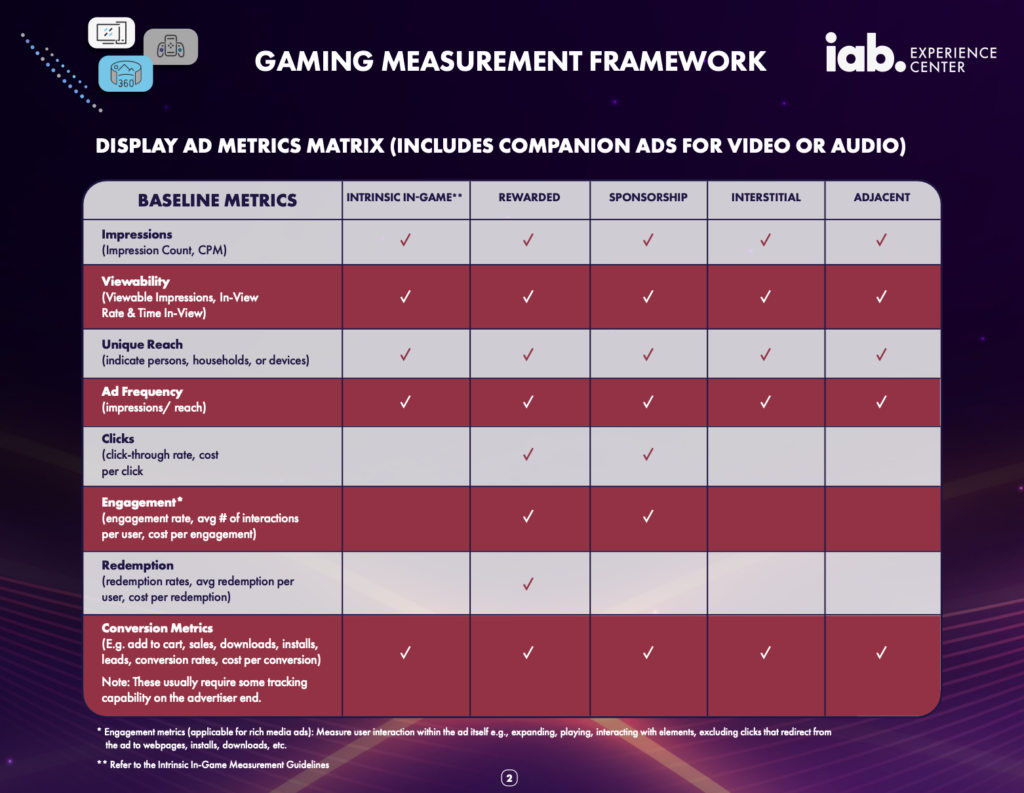 Avec le lancement en 2025 du IAB Gaming Measurement Framework, l’industrie franchit une étape clé. Ce cadre permet désormais de définir clairement les formats publicitaires in-game et d’établir des standards de mesure, avec des indicateurs essentiels et complémentaires.